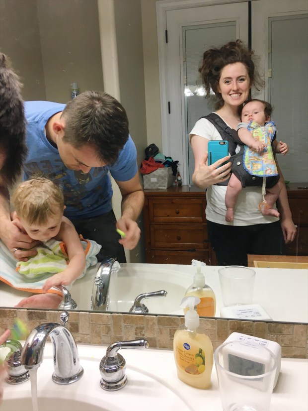 This is what 2 under 2 night time routine looks like. Hazel’s evening fussy time kicking in, Marc brushing her teeth (she LOVES to brush her teeth. She normally throws a fit when we put it away), music may or may not be playing, and I try to sneak in a kiss or goose on Marc.