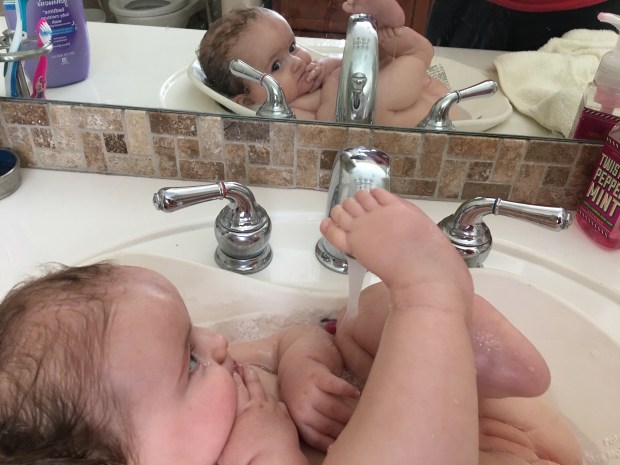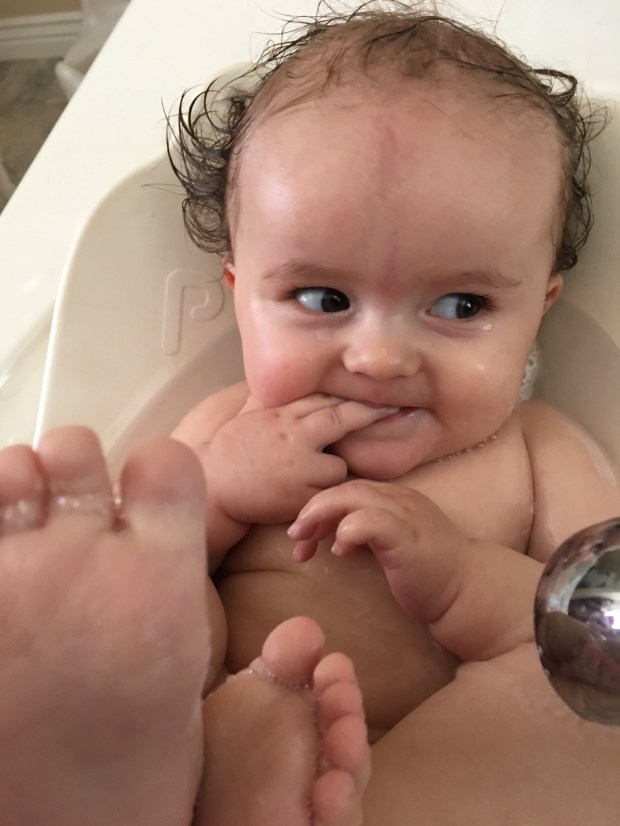 Both girls love taking baths and getting in the shower. Hazel has almost grown out of her puj bathtub. It is my favorite newborn bath item. It fits so perfectly in He bathroom sink.
