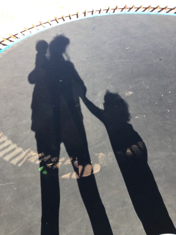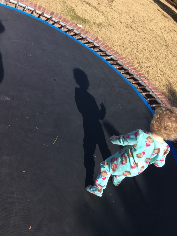 The girls and I were jumping on the tramp and all of a sudden Ruby froze and stared at the tramp. Terrified- she learned she has a shadow.
