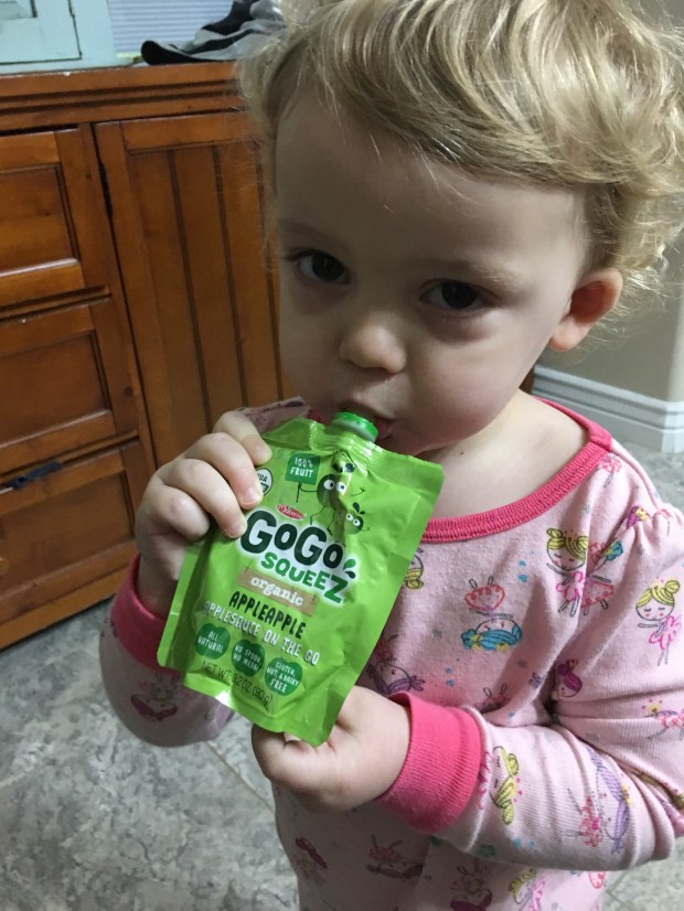 My diaper bag is kept on higher ground on purpose so Ruby does not go exploring, but the other morning it was left open on the couch. Ruby reached right in and pulled out two Apple squeezies and proudly said “squeeze and Hazel!” (Translation: Mom! I got a squeezie for me and Hazel!)