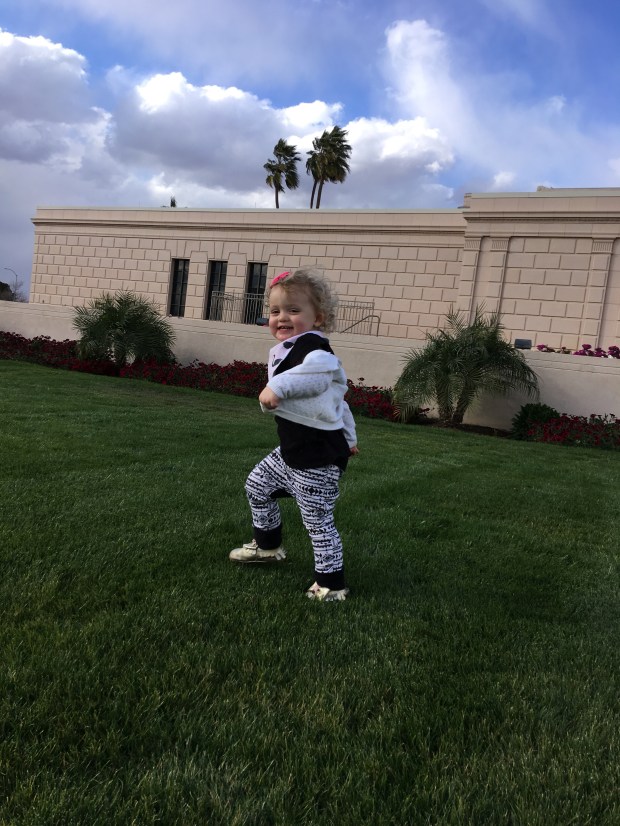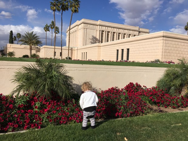On Friday, after naps I took both the girls by myself down to Mesa Riverview to pick up Marc and mine half marathon T-shirt’s and packets for the Phoenix Marathon. We had signed up to run but it ended up be too much for me to train and nurse Hazel. But Marc and I figured we should at least pick up the shirts we paid for. So it was me with Hazel strapped to my front in the baby carrier, Ruby in our little zebra stroller, and my red diaper bag backpack on maneuvering through the crowds of people at the race pick up. I just felt like everyone was staring at me and my girls. And I sorta felt embarrassed for my little family was toting, which is so silly because I love them with all my heart. Marc was suppose to have a service project that went past dinner so I planned to take the girls to the visit center before heading home. It was so nice the peace that was there and difference it made.