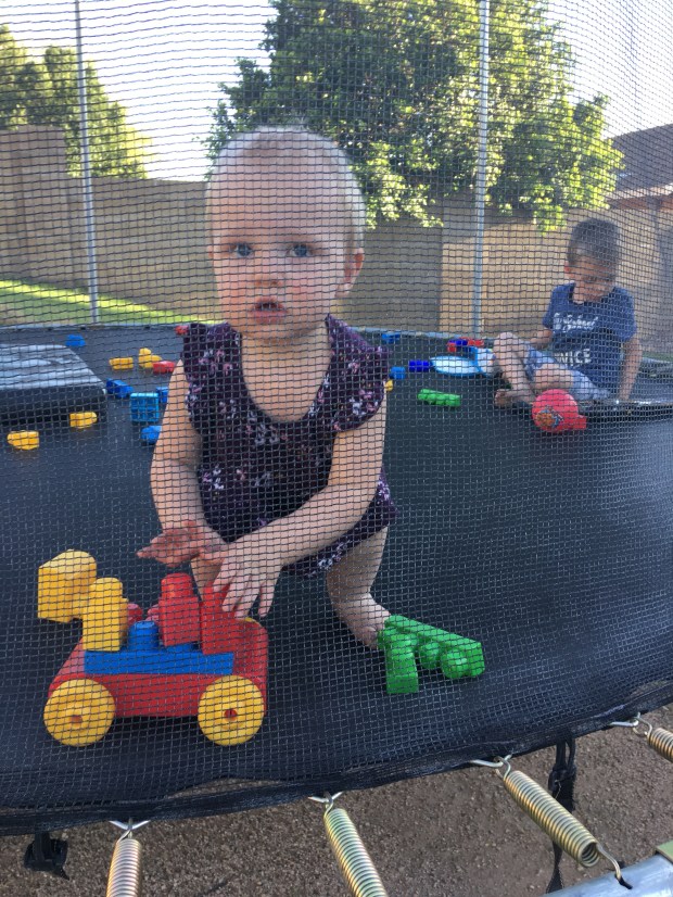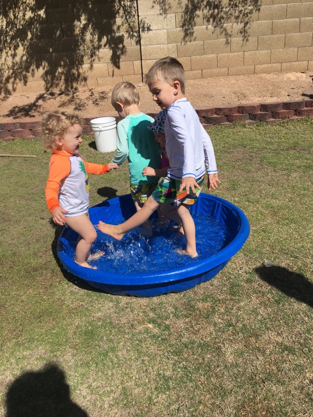 For the most part it was really a great time! We ate lots of egos, strawberries, blues (blueberries), cheese crisps, and applesauce. We played on the baby bouncy house and trampoline and even busted out the baby swimming pool.