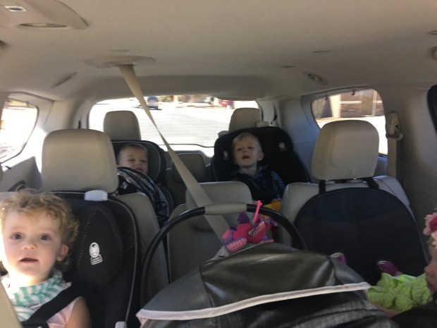 this is Jo’s car with 5 car seats and 5 babies!