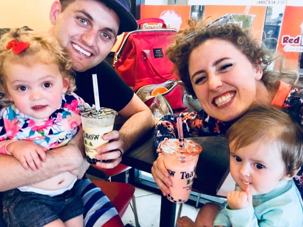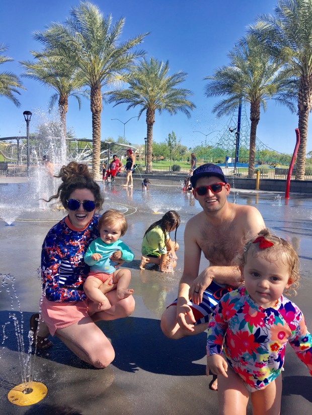 Marc came home early from school (!!!) and when the girls woke up he had us all get our swim suits on for a surprise family water outing – Bobas and the splash pad!