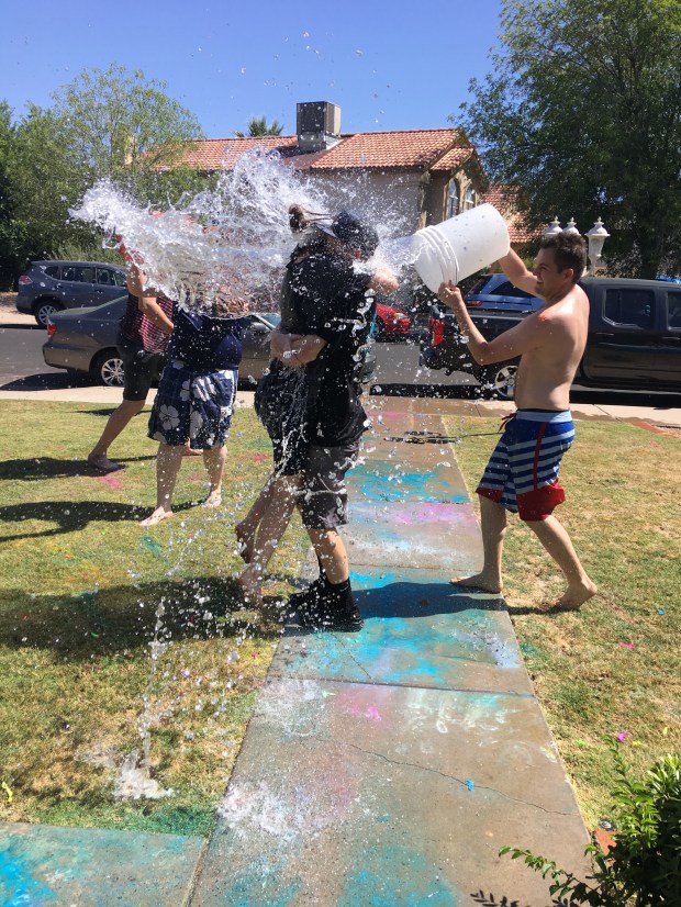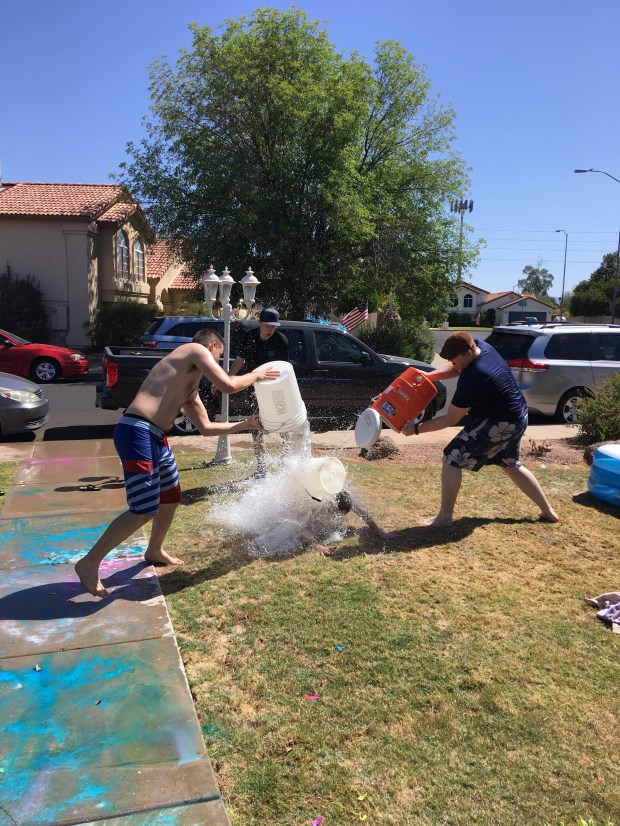 Johnson family wet kick off to summer!!! We had the blow up pool, water balloons, spray paint chalk, pan cakes, buckets of waters, and brothers who can’t resist dumping buckets of water, and swimming at Big Hs.