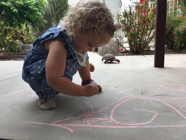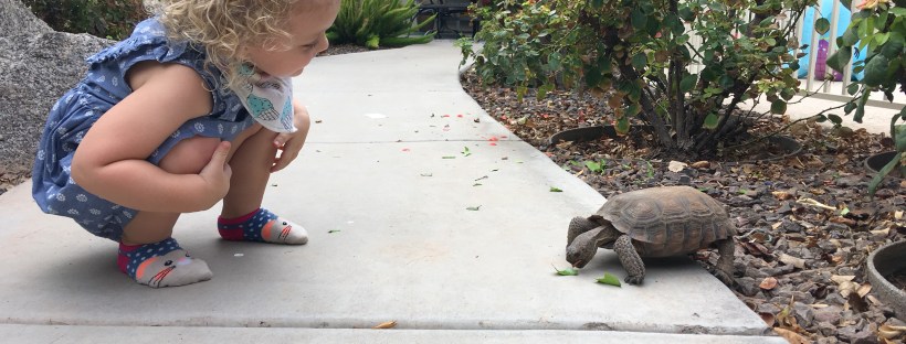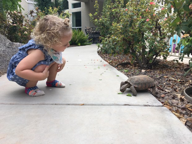 This morning we were playing inside when I spotted Gypsy though the window strolling around the pool. She is the Denton’s tortoise and Ruby only has all the heart eyes for Gypsy.