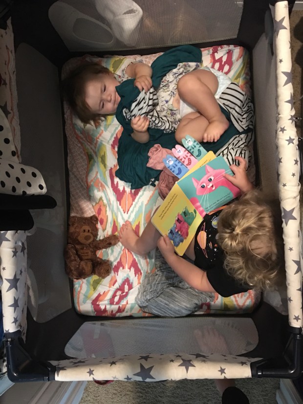 Ruby always runs to Hazel’s napping crib (yes it’s in my closet 😬) is SO excited to see her and insists on jumping in and being right next to her. Hazel is less delighted having such a perky person nearby when she first wakes up [[[[[[[[[[[