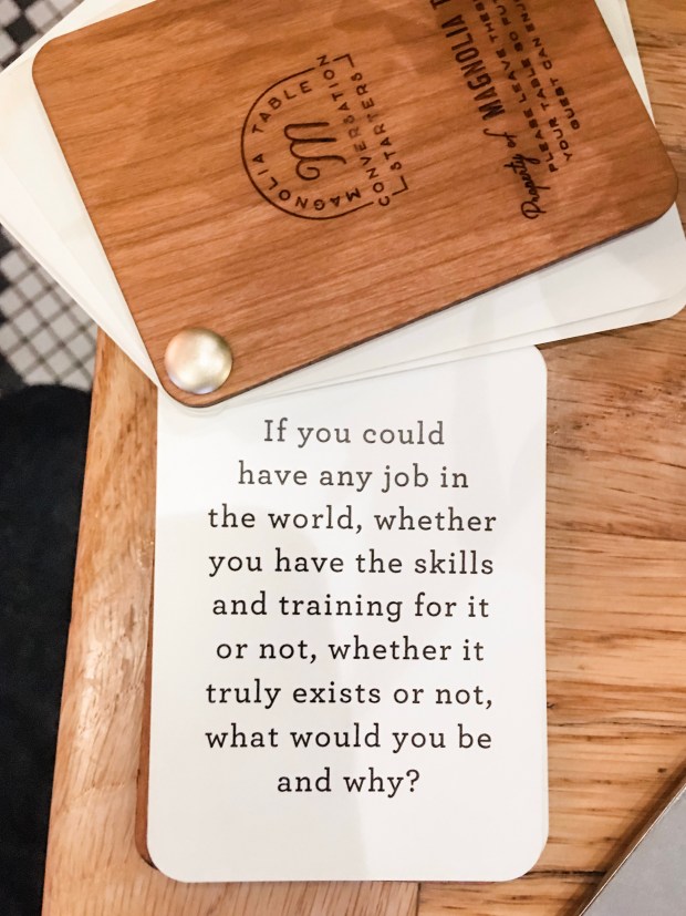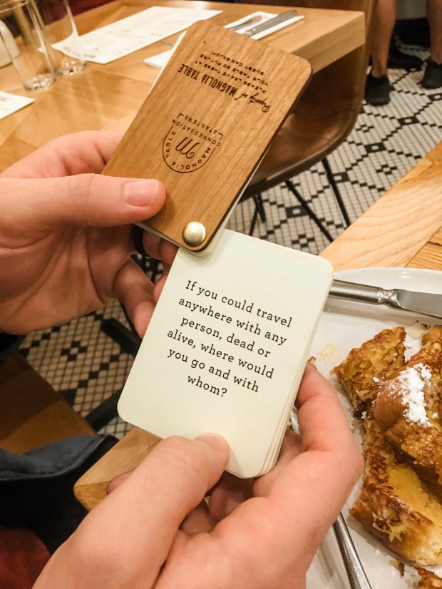 One of our favorite parts, other than the food and butter (mmmm strawberry butter… drool), was the conversation starter books on the tables, filled with fun questions to make you think, or laugh, and get you talking. Like, if you could have any job, real or not, what would it be? Without missing a beat Marc said, “Friday Spider-Man. There would be a lot of pressure to be Spider-Man all the time but Friday’s would keep it exciting.” I laughed. And loved him just a little more. I would be a Disney princess or be on the creative team for Anthropology or Magnolia.