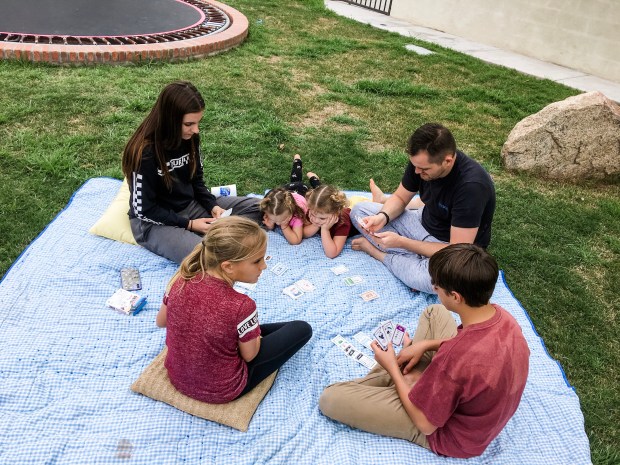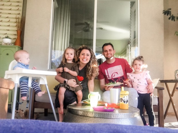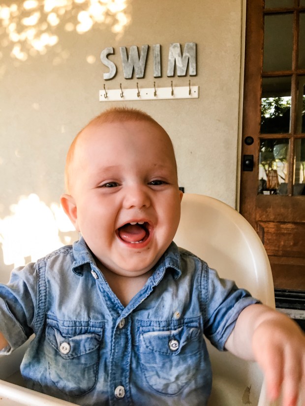 Every afternoon we play Cover Your Assets out in the yard with Eve, Hyrum, and Micah. We bring the cards and they bring a snack, like a giant bag of goldfish or a bag of pretzels, to occupy the babies while we play. Levi plays happily on the blanket or sitting on my lap with the card box or small toy but we all know to feed the Baby Buddha when he starts getting fussy.