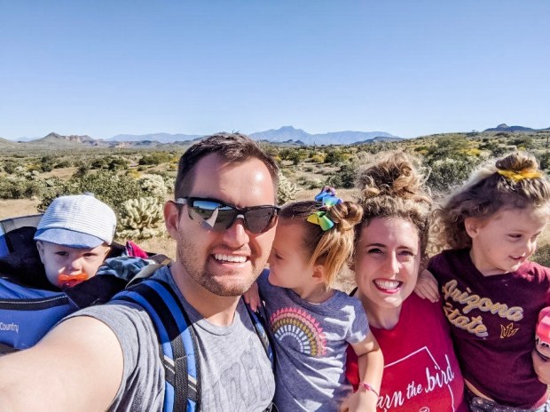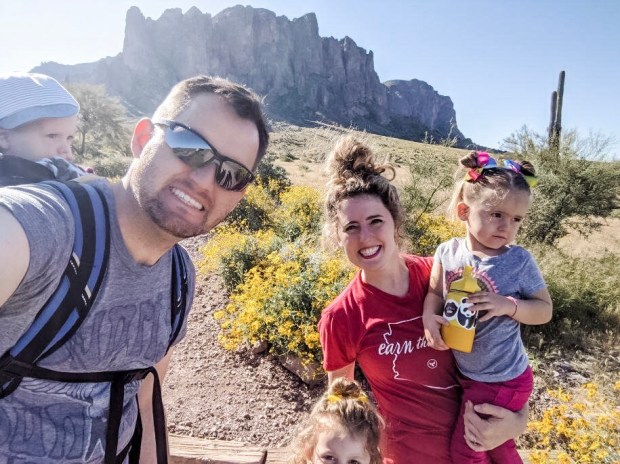 We went on a hike to Lost Dutchman State Park. I use the term “we” and “hike” loosely because the “we” was mainly Marc and I. Marc had Levi in a baby hike backpack and I took turns between holding Ruby and Hazel for short stretches. Hiking is so much further for little legs. But the desert was beautiful and Flat Iron is breathtaking and looks like a fake backdrop. But the girls favorite part was making rock stacks on the path when we took short breaks.