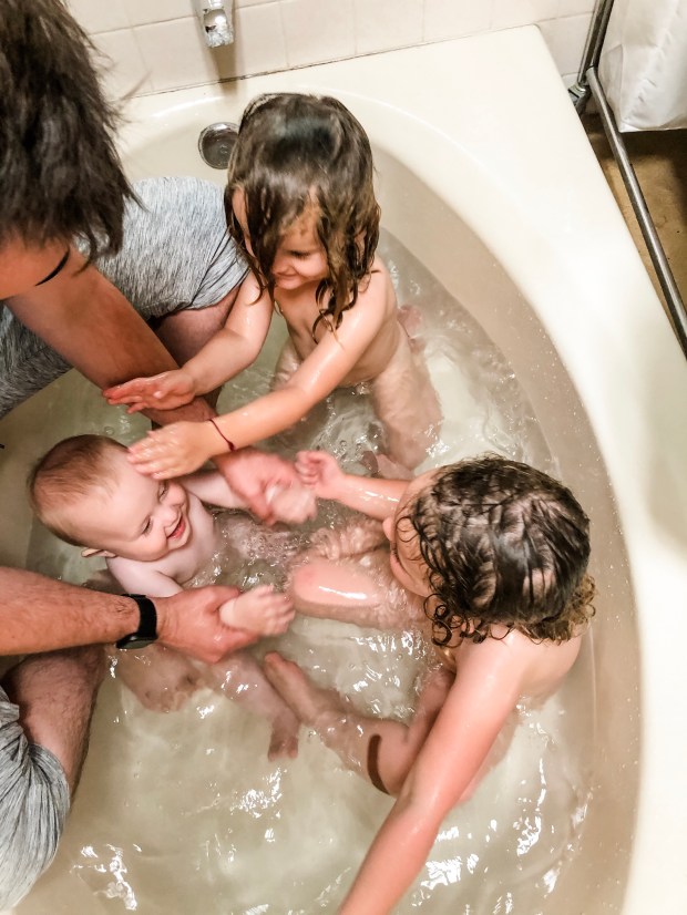 Saturday, we postponed our pizza night to have dinner at my moms. Jake, Dad, Chelsea, McKay and Marc finishes a 1,000 piece puzzle (impressive). We had a tasty hot dinner and watched The Fantastic Mr. Fox. We only have a shower at home, so the girls always beg to take a bath at my moms. So we washed a happy tub full of babies.