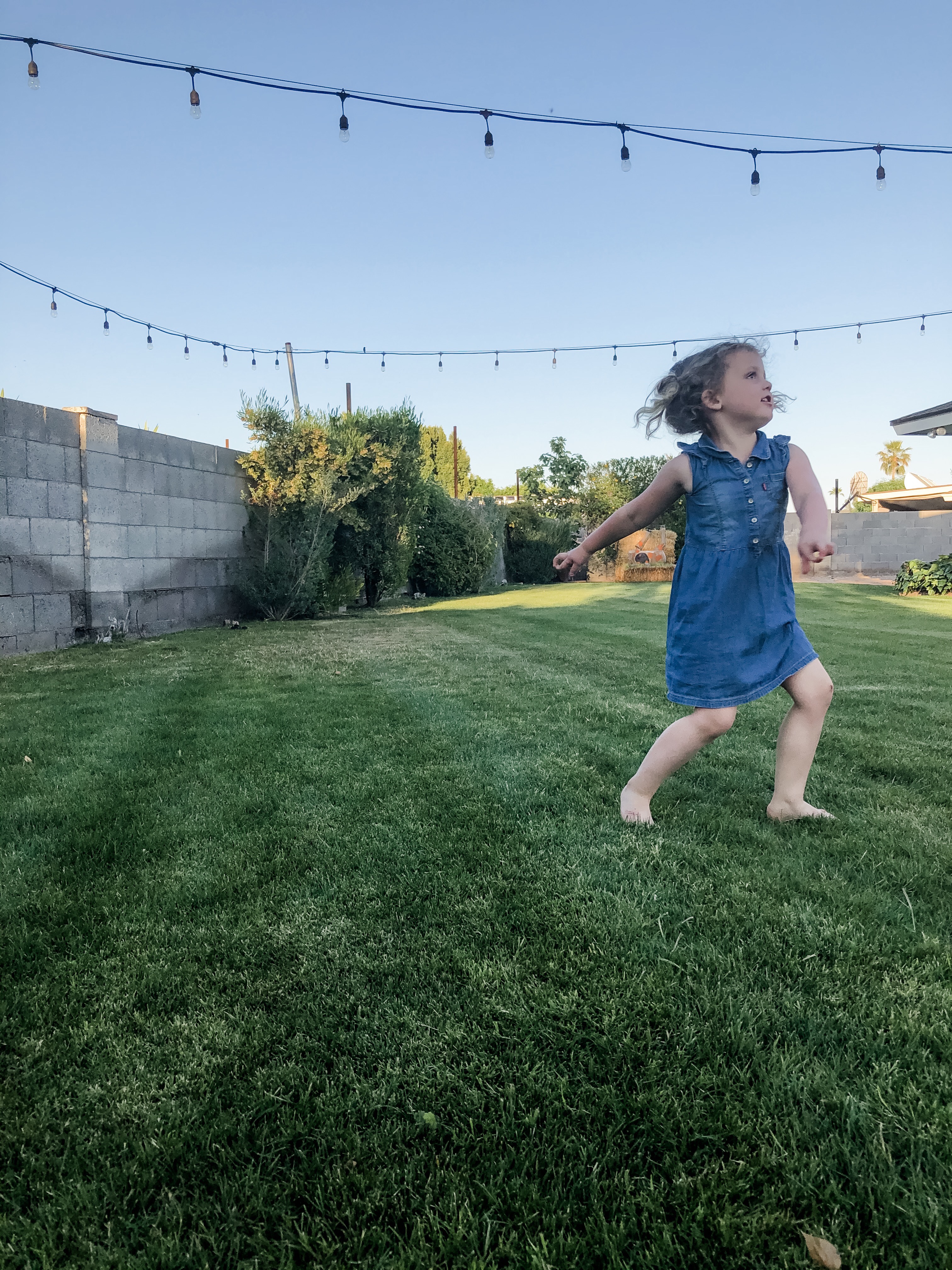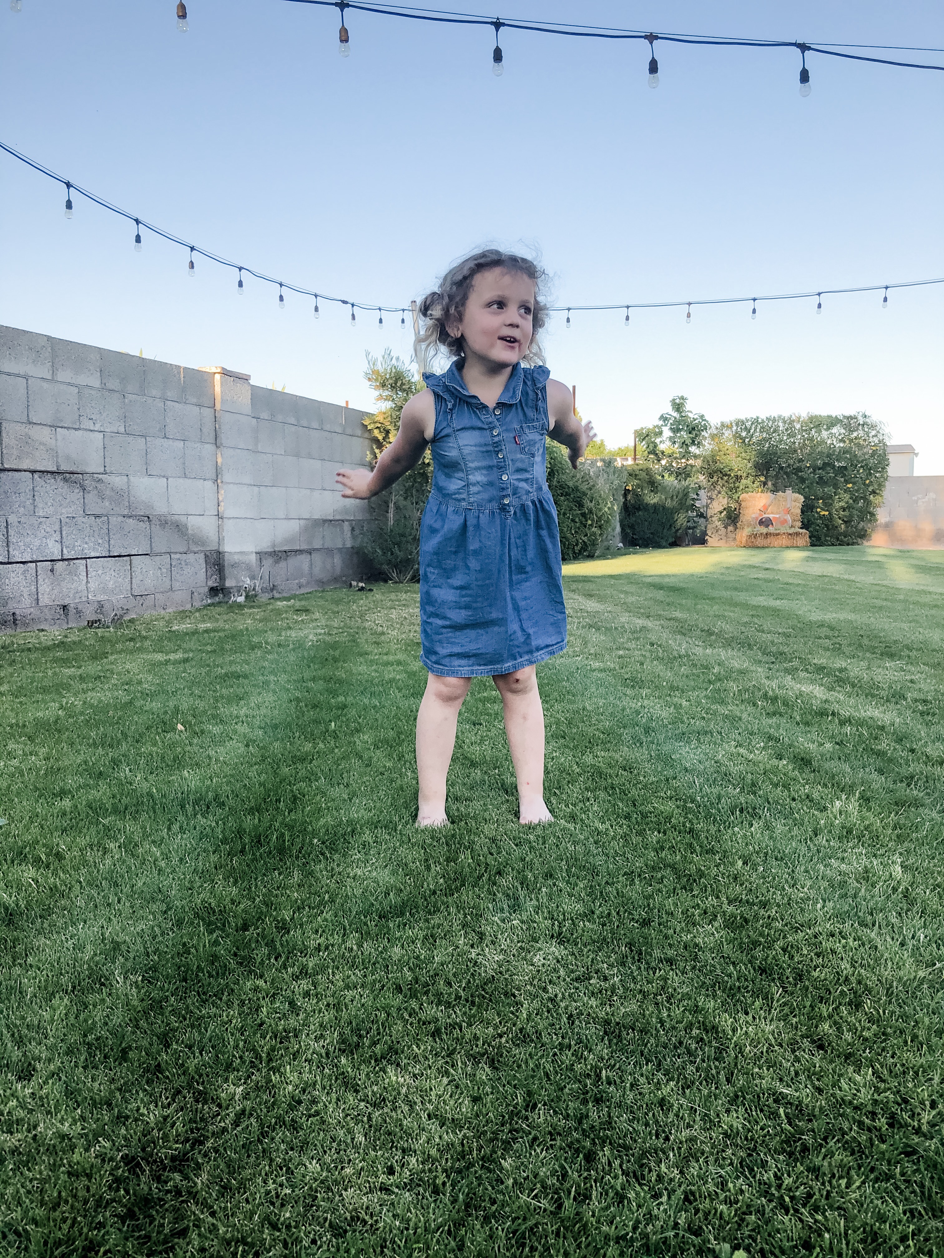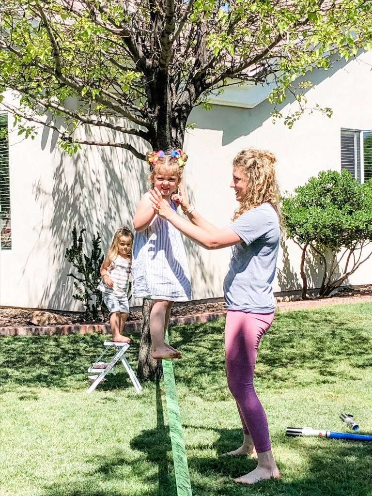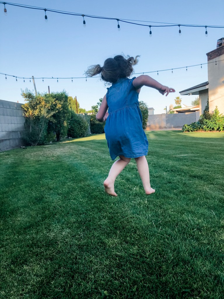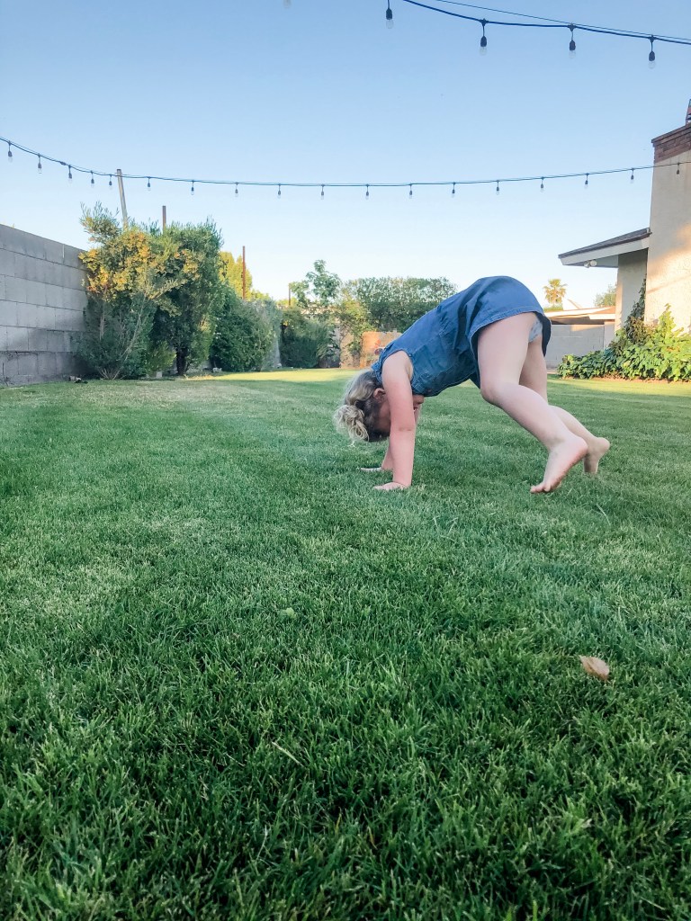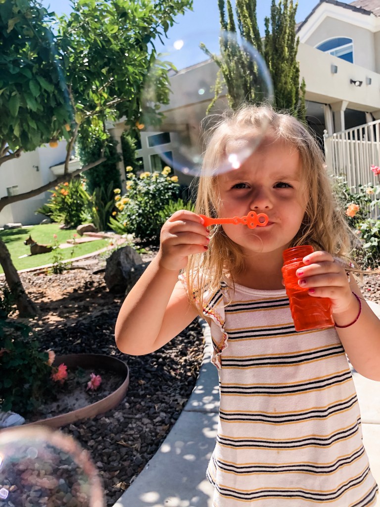 This is the beautiful brownie trifle I made – fudge brownies, homemade caramel sauce, chocolate mousse, strawberries, and fresh whipped cream. It’s real good. Marc said,” Only the best for Jesus on Easter because the resurrection is so sweet.”Papa Tucker did the beautiful flower arrangement. The girls Easter dresses are from Alisa’s wedding in December. But the girls got sick and didn’t get a chance to wear them then. So thanks Alisa for picking fantastic winter wedding colors that also make the prettiest dresses for Spring. This boy thinks he is so funny and tries to pull out all the wipes any chance he can get. Hazel wanted to “do my hair” with her glow stick. She kept telling me,”Mom, your hair just looks so beautiful!” I don’t know why this boy thinks he is SO big and that he can just crawl up on stuff whenever he wants…“Look Mom, one hand.”For Family Home Evening, we had a lesson about King Benjamin,one of my favorites from The Book of Mormon. And he gives his sermon from a tower so all his people could hear, so we did the same with bowls of kettle corn. The girls convinced Marc to take them swimming. He kept telling me this would be super short lived and they would be back inside in no time. Thirty minutes later, the girls reluctantly came in to take a warm shower despite their chattering teeth.This is easily my favorite photo from the week!! Hazel doing her thing, blowing bubbles.The Denton’s hung up their slack line, so we all took a stab at it. You know, just working on our quarantine skills.And Levi sat happily in the shade with a sea of goldfish to munch on while we tried our best at balancing. This is a typical morning: me trying to finish my workout before everyone is awake (never happens) and my kids play doctor and busily perform life saving surgery while I finish my cool down. We spent the morning at Jo’s and this cute guy got his hair cut again. Levi es muy guapo!One night this week, I was making dinner at home when my mom called. She was making dinner at her house. She said she was making chili and cornbread. I told her that sounded much better than what I was making and asked if we could have dinner at her house? “If you want.” So we had a dinner party at Grammy’s! We played on the backyard and Ruby asked if I would take her photo. So here is a series of action shots of Ruby that just make my heart happy. The grand finale! This week I asked Ruby what she wants to be when she grows up, “a big girl!” Friday was irrigation day at our house. (Or Moana water as my girls like to call it. Because it looks like the ocean in our backyard) We played out on it all morning. Isn’t our backyard so dreamy?Eve pulling Hazel on the skim board Hyrum pulling Ruby on the skim board Hazel cracks me up. This is the only way she likes to get her hair wet. Ruby played mermaid like this in the water for sometime, completely content on her ownSaturday we washed Nacho. The girls LOVE washing the car with Marc. They always cheer and race to get their suits on. Saturday afternoon, Levi and I were convinced to make it out to the pool with the rest of the family, though we did not venture into the freezing water“SO COLD” Brad’s flowers arches are just gorgeous and needed to be documented.