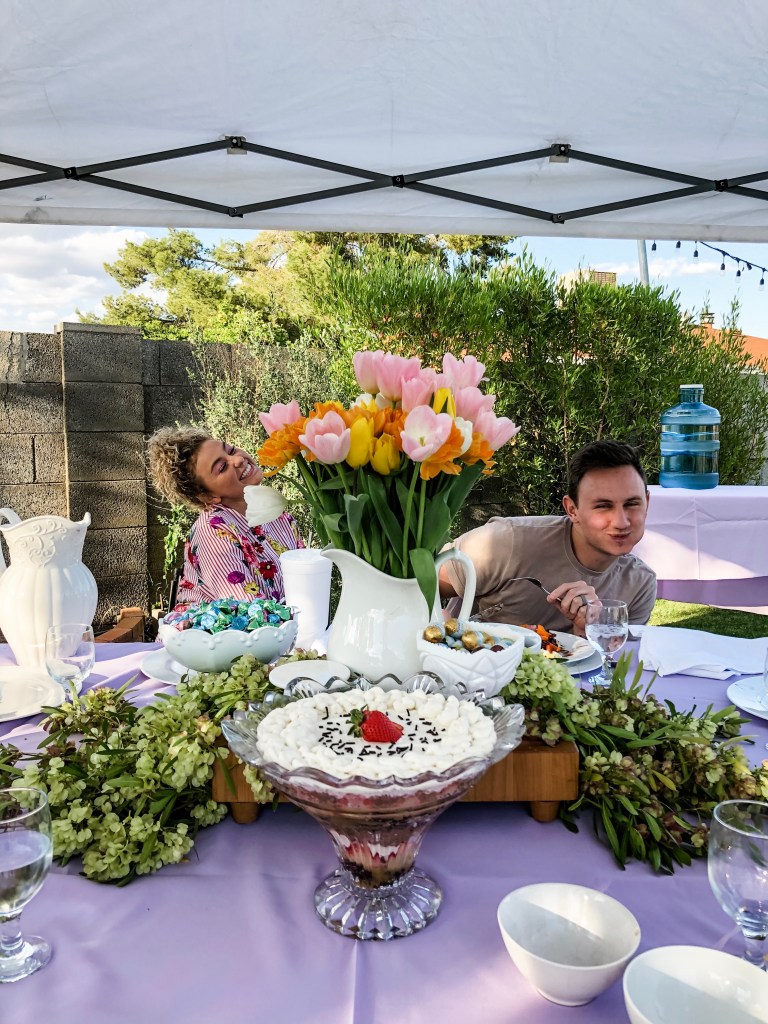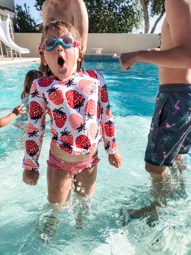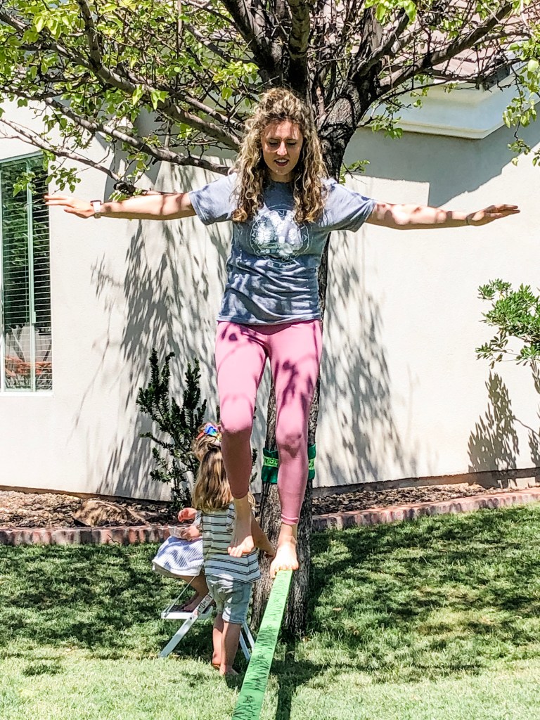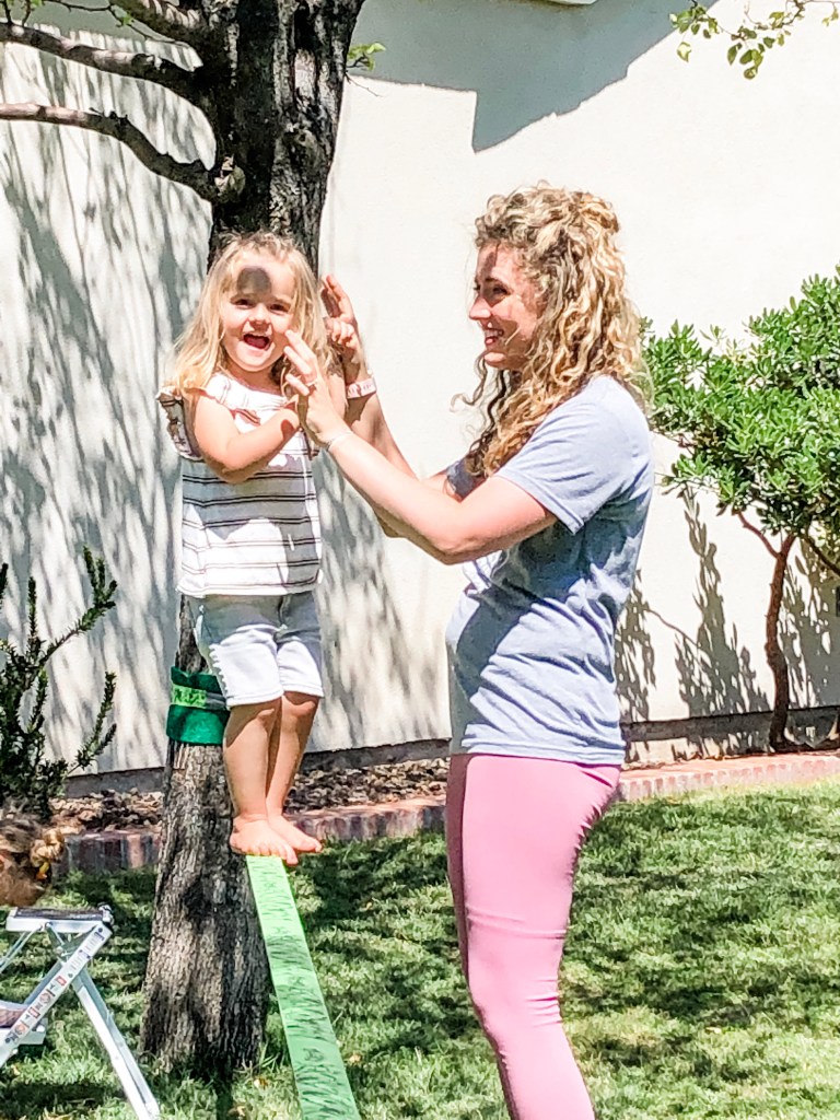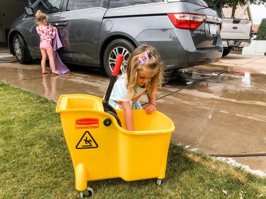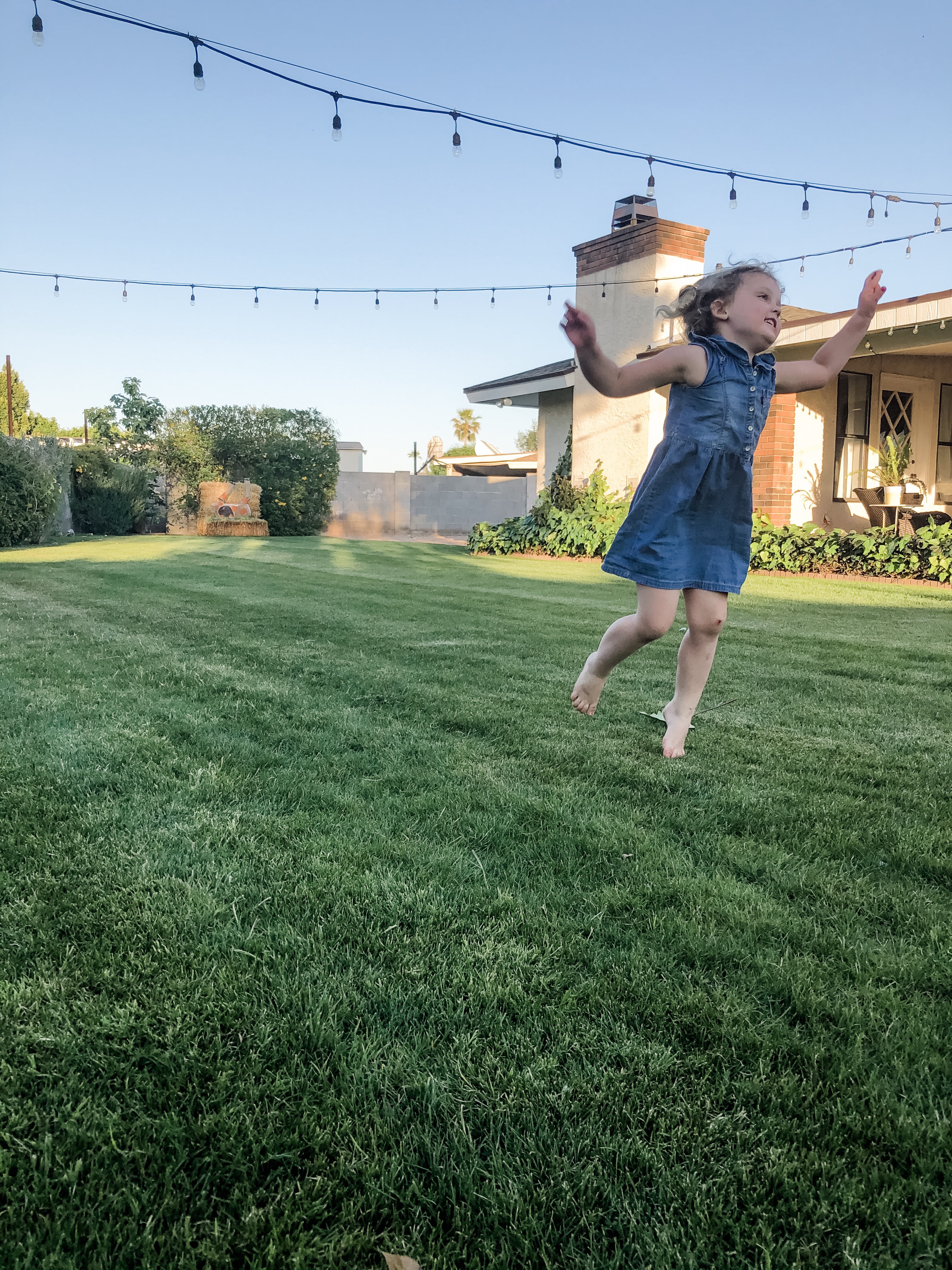 This is the beautiful brownie trifle I made – fudge brownies, homemade caramel sauce, chocolate mousse, strawberries, and fresh whipped cream. It’s real good. Marc said,” Only the best for Jesus on Easter because the resurrection is so sweet.”Papa Tucker did the beautiful flower arrangement. The girls Easter dresses are from Alisa’s wedding in December. But the girls got sick and didn’t get a chance to wear them then. So thanks Alisa for picking fantastic winter wedding colors that also make the prettiest dresses for Spring. This boy thinks he is so funny and tries to pull out all the wipes any chance he can get. Hazel wanted to “do my hair” with her glow stick. She kept telling me,”Mom, your hair just looks so beautiful!” I don’t know why this boy thinks he is SO big and that he can just crawl up on stuff whenever he wants…“Look Mom, one hand.”For Family Home Evening, we had a lesson about King Benjamin,one of my favorites from The Book of Mormon. And he gives his sermon from a tower so all his people could hear, so we did the same with bowls of kettle corn. The girls convinced Marc to take them swimming. He kept telling me this would be super short lived and they would be back inside in no time. Thirty minutes later, the girls reluctantly came in to take a warm shower despite their chattering teeth.This is easily my favorite photo from the week!! Hazel doing her thing, blowing bubbles.The Denton’s hung up their slack line, so we all took a stab at it. You know, just working on our quarantine skills.And Levi sat happily in the shade with a sea of goldfish to munch on while we tried our best at balancing. This is a typical morning: me trying to finish my workout before everyone is awake (never happens) and my kids play doctor and busily perform life saving surgery while I finish my cool down. We spent the morning at Jo’s and this cute guy got his hair cut again. Levi es muy guapo!One night this week, I was making dinner at home when my mom called. She was making dinner at her house. She said she was making chili and cornbread. I told her that sounded much better than what I was making and asked if we could have dinner at her house? “If you want.” So we had a dinner party at Grammy’s! We played on the backyard and Ruby asked if I would take her photo. So here is a series of action shots of Ruby that just make my heart happy. The grand finale! This week I asked Ruby what she wants to be when she grows up, “a big girl!” Friday was irrigation day at our house. (Or Moana water as my girls like to call it. Because it looks like the ocean in our backyard) We played out on it all morning. Isn’t our backyard so dreamy?Eve pulling Hazel on the skim board Hyrum pulling Ruby on the skim board Hazel cracks me up. This is the only way she likes to get her hair wet. Ruby played mermaid like this in the water for sometime, completely content on her ownSaturday we washed Nacho. The girls LOVE washing the car with Marc. They always cheer and race to get their suits on. Saturday afternoon, Levi and I were convinced to make it out to the pool with the rest of the family, though we did not venture into the freezing water“SO COLD” Brad’s flowers arches are just gorgeous and needed to be documented.