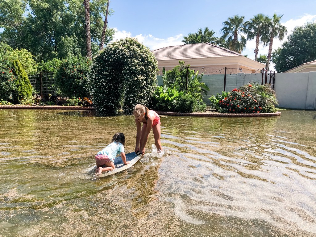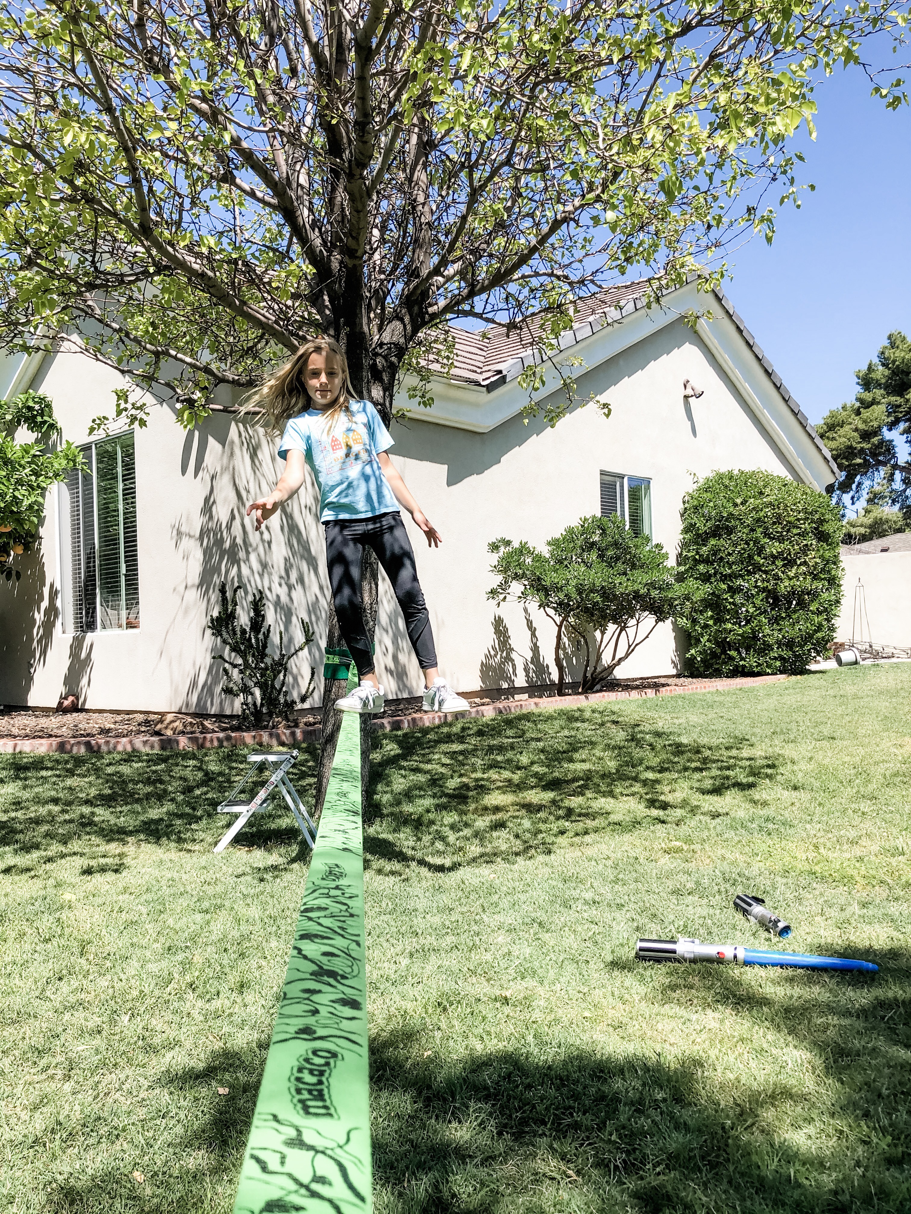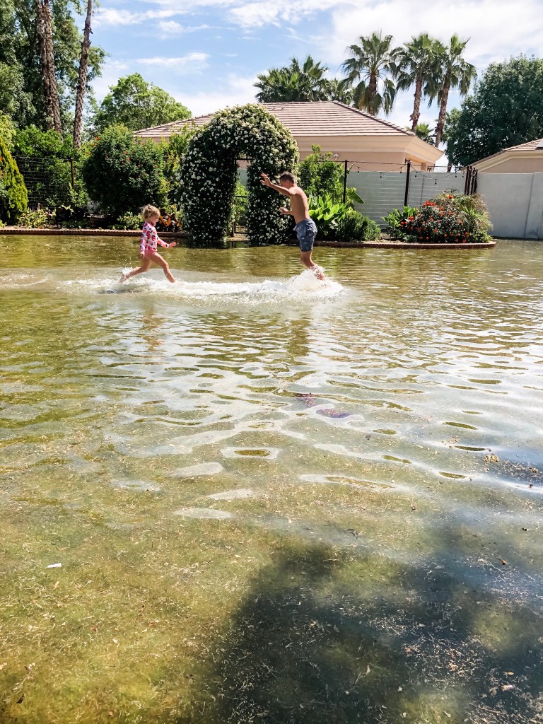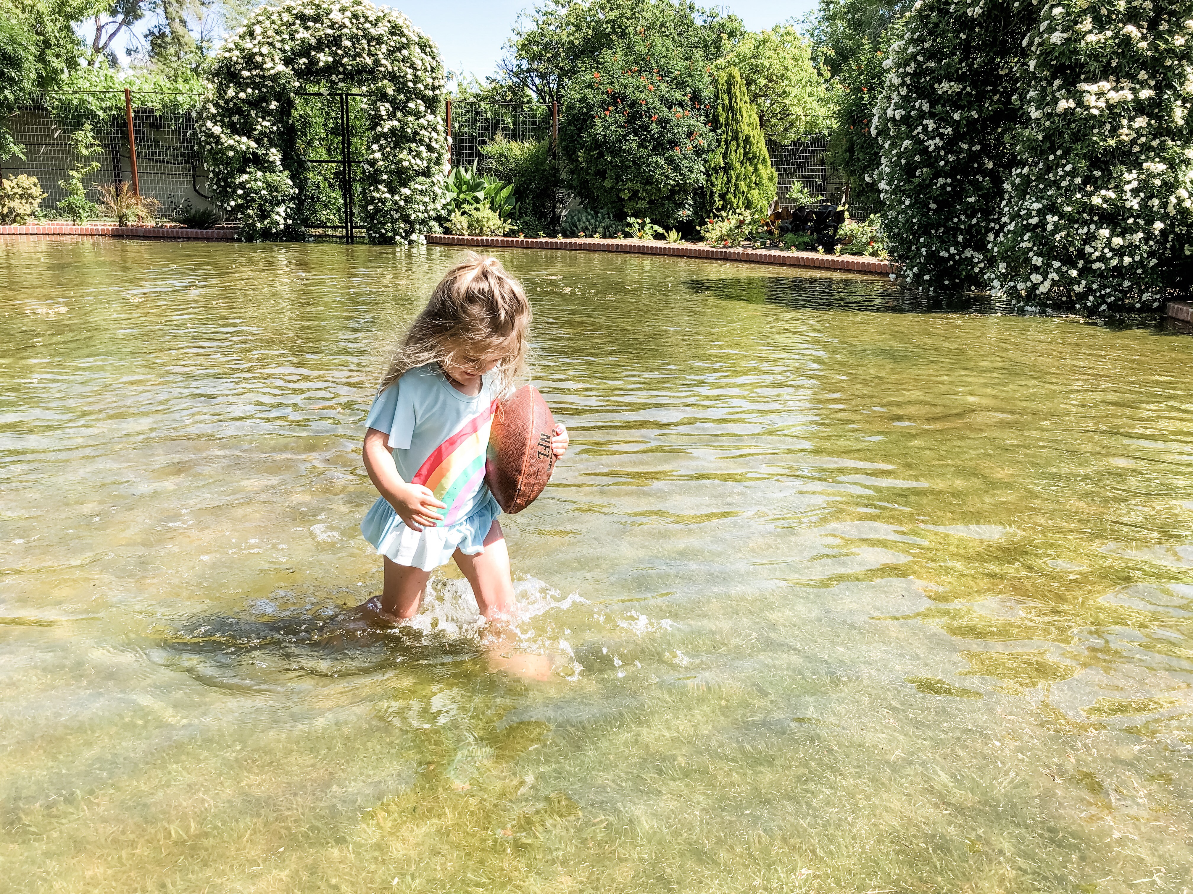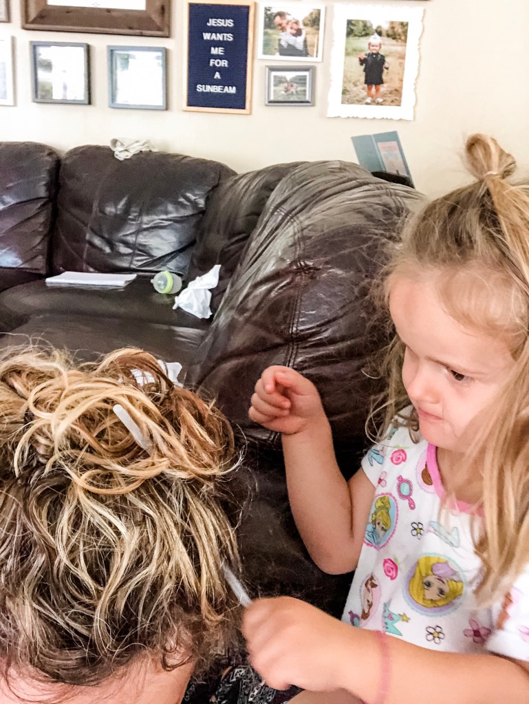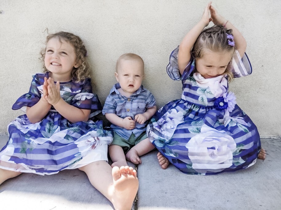 This is the beautiful brownie trifle I made – fudge brownies, homemade caramel sauce, chocolate mousse, strawberries, and fresh whipped cream. It’s real good. Marc said,” Only the best for Jesus on Easter because the resurrection is so sweet.”Papa Tucker did the beautiful flower arrangement. The girls Easter dresses are from Alisa’s wedding in December. But the girls got sick and didn’t get a chance to wear them then. So thanks Alisa for picking fantastic winter wedding colors that also make the prettiest dresses for Spring. This boy thinks he is so funny and tries to pull out all the wipes any chance he can get. Hazel wanted to “do my hair” with her glow stick. She kept telling me,”Mom, your hair just looks so beautiful!” I don’t know why this boy thinks he is SO big and that he can just crawl up on stuff whenever he wants…“Look Mom, one hand.”For Family Home Evening, we had a lesson about King Benjamin,one of my favorites from The Book of Mormon. And he gives his sermon from a tower so all his people could hear, so we did the same with bowls of kettle corn. The girls convinced Marc to take them swimming. He kept telling me this would be super short lived and they would be back inside in no time. Thirty minutes later, the girls reluctantly came in to take a warm shower despite their chattering teeth.This is easily my favorite photo from the week!! Hazel doing her thing, blowing bubbles.The Denton’s hung up their slack line, so we all took a stab at it. You know, just working on our quarantine skills.And Levi sat happily in the shade with a sea of goldfish to munch on while we tried our best at balancing. This is a typical morning: me trying to finish my workout before everyone is awake (never happens) and my kids play doctor and busily perform life saving surgery while I finish my cool down. We spent the morning at Jo’s and this cute guy got his hair cut again. Levi es muy guapo!One night this week, I was making dinner at home when my mom called. She was making dinner at her house. She said she was making chili and cornbread. I told her that sounded much better than what I was making and asked if we could have dinner at her house? “If you want.” So we had a dinner party at Grammy’s! We played on the backyard and Ruby asked if I would take her photo. So here is a series of action shots of Ruby that just make my heart happy. The grand finale! This week I asked Ruby what she wants to be when she grows up, “a big girl!” Friday was irrigation day at our house. (Or Moana water as my girls like to call it. Because it looks like the ocean in our backyard) We played out on it all morning. Isn’t our backyard so dreamy?Eve pulling Hazel on the skim board Hyrum pulling Ruby on the skim board Hazel cracks me up. This is the only way she likes to get her hair wet. Ruby played mermaid like this in the water for sometime, completely content on her ownSaturday we washed Nacho. The girls LOVE washing the car with Marc. They always cheer and race to get their suits on. Saturday afternoon, Levi and I were convinced to make it out to the pool with the rest of the family, though we did not venture into the freezing water“SO COLD” Brad’s flowers arches are just gorgeous and needed to be documented.
