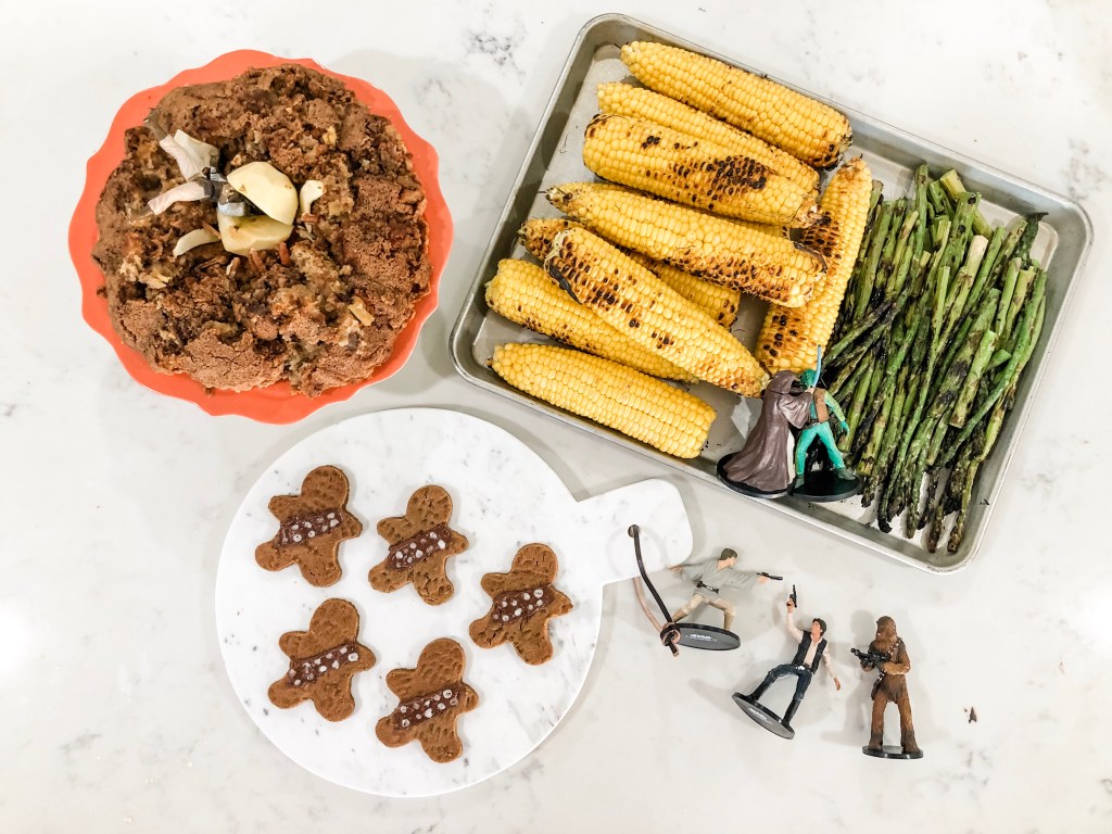 You could say the force was strong at our Star Wars dinner at Jo and Ty’s. We only wished Abby and Jake could have made it. We grilled and baked the most delicious space inspired meal. We were going to do Death Star pizzas but we did pizza together on Sunday so Jo made disassembled chicken pot pie, which is one of my all time favorites and tastes like our childhood. Mmmmm