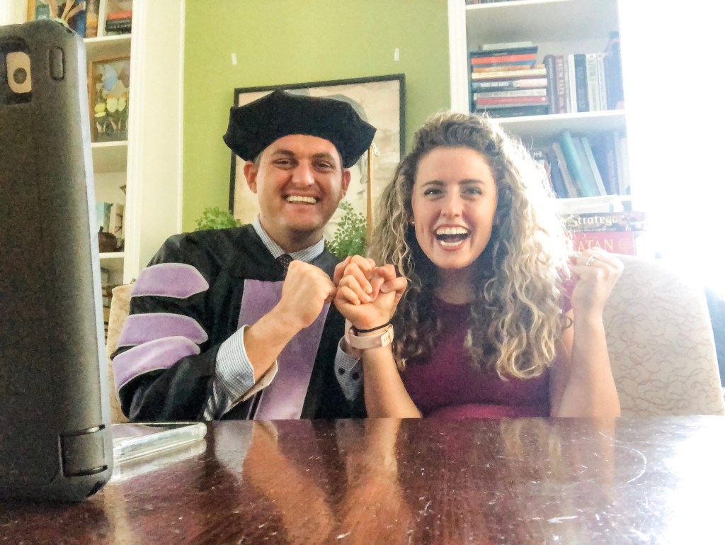With COVID, Marc’s formal graduation was canceled a few weeks ago. So Marc and I got all dressed up, Marc wore his dental graduation robes and I wore my crimson dress that Marc loves, and we sat in the Denton’s library and watched Marc ceremonially become a doctor over a prerecorded YouTube video. Seven years lead up to this moment that screamed for a celebration… and anticlimactic doesn’t begin to describe it. We got a little teary eyed as we cheered when our friends names came across the screen. Friends we will likely never see again in person. It was a long four years with the same group of fantastic people. But we both agreed it was fun to get to hold hands and sit together through the ceremony. That would never have happened otherwise. And we started dreaming of dental school with just the two of us, and it was beautifully poetic to end it the same way.