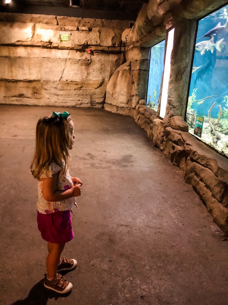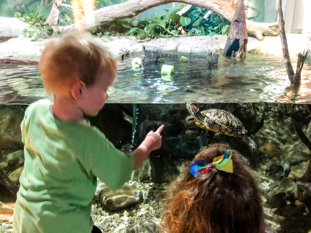 It started raining then pouring. and it didn’t stop pouring. We all ran under a giant ramada and had an early lunch, but the rain didn’t lighten up. So we dashed to the indoor aquarium exhibit. We were all wet wet wet. There is one tank that is just filled with fish from Finding Nemo. It’s really fun. Though the Nemo fish (clown fish) actually is quite hard to find as it hides behind the large rocks in the back of the tank most of the time. So Hazel was trying to convince it to come out, “Hey little Nemo fish, you can come out. It’s not scary. We are nice.”