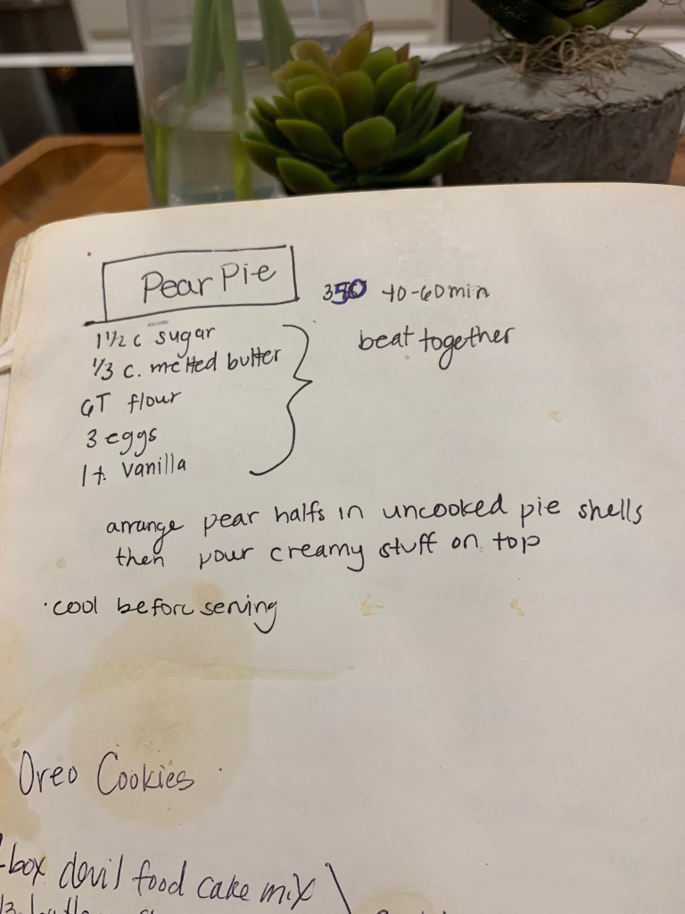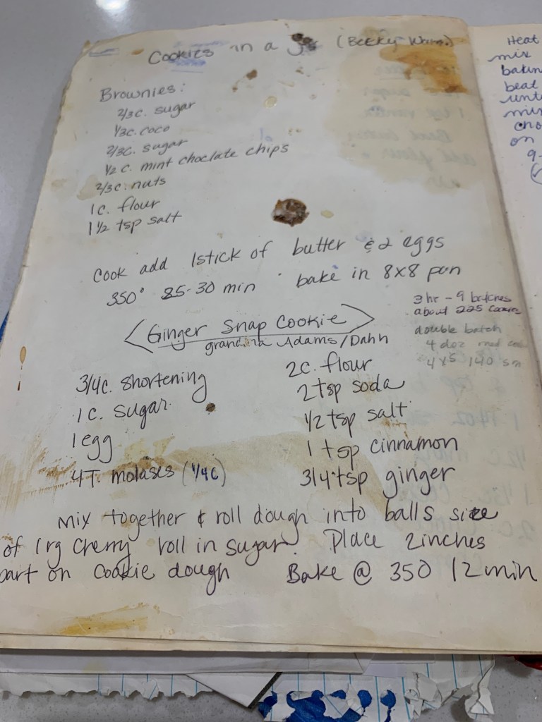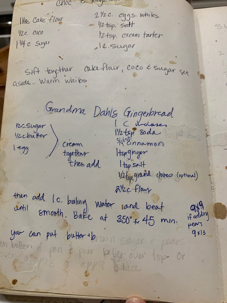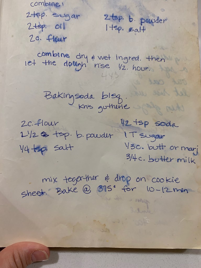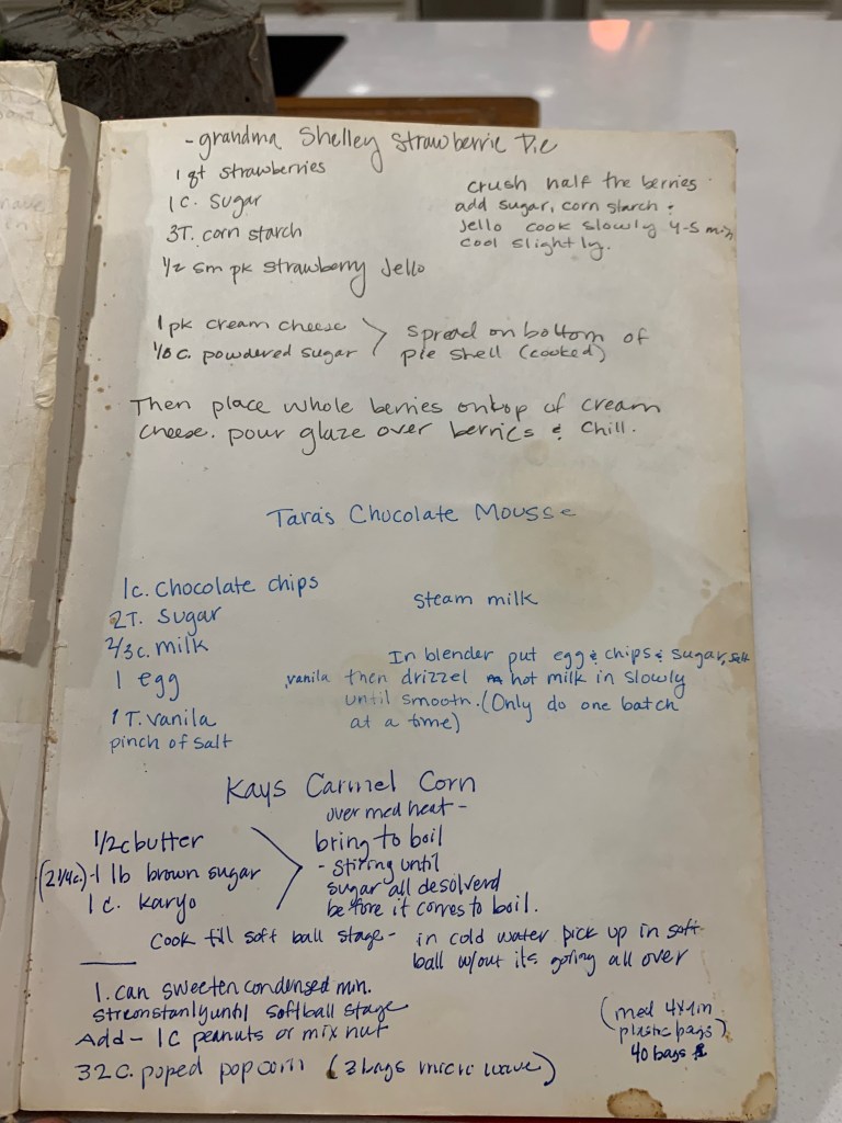 My mom is one of the best cooks and bakers around. And she keeps all of her favorite recipes in her treasured Red Cook Book. To some, it would look like an ordinary, red bound, blank paged read sketch book. But to the well trained eye, and stomach, you would know it is magical and may be considered cookbook scriptures. (Is that wrong to say?) most of my childhood happy food memories come from The Red Cook Book. So before my mom came out for a visit, I wanted to make some recipes from it together. So I had her send me some recipes. So I thought I would just save them here as a reference spot for me, till I actually sit down to write them down in my own Red Cook Book (although mine is actually a light lime green).