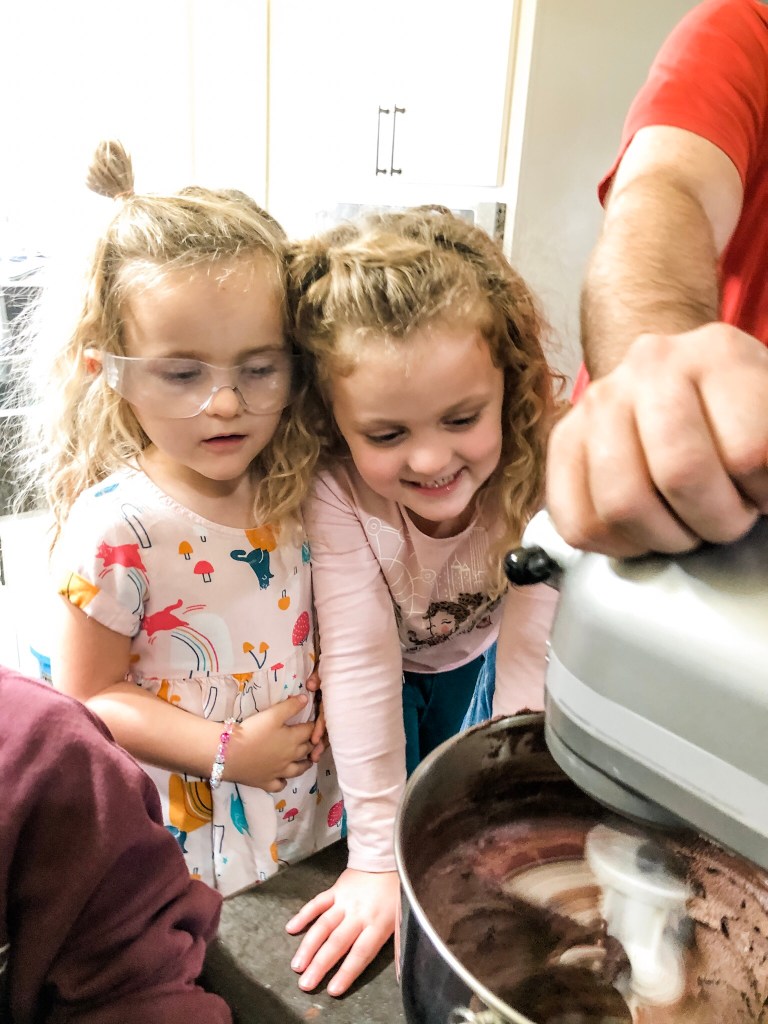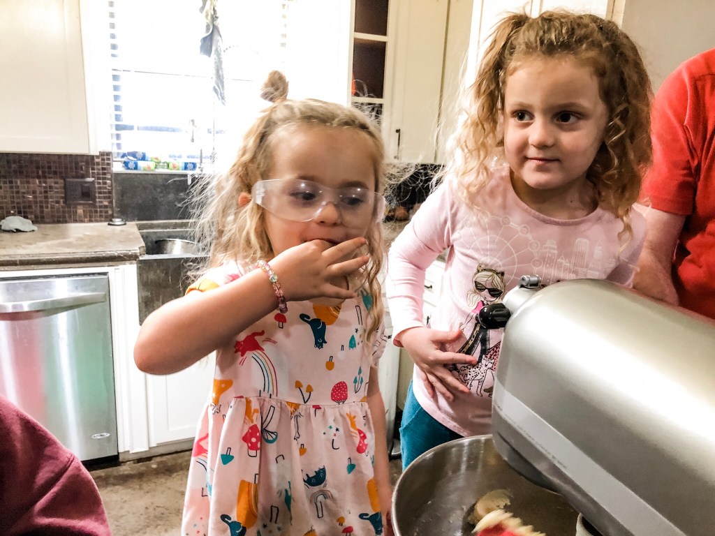 We spent some seriously fun times with our friends the Barry’s. One of the afternoons at their house, Meg and Kenneth were going to help me orchestrate getting my car to the shop with three small kids but Kenneth ended up solving the problem when he had to jump my car. #Win! So instead of going to the shop, we made cookies. Hazel insisted on wearing eye protection before she would participate in said cookie making.
